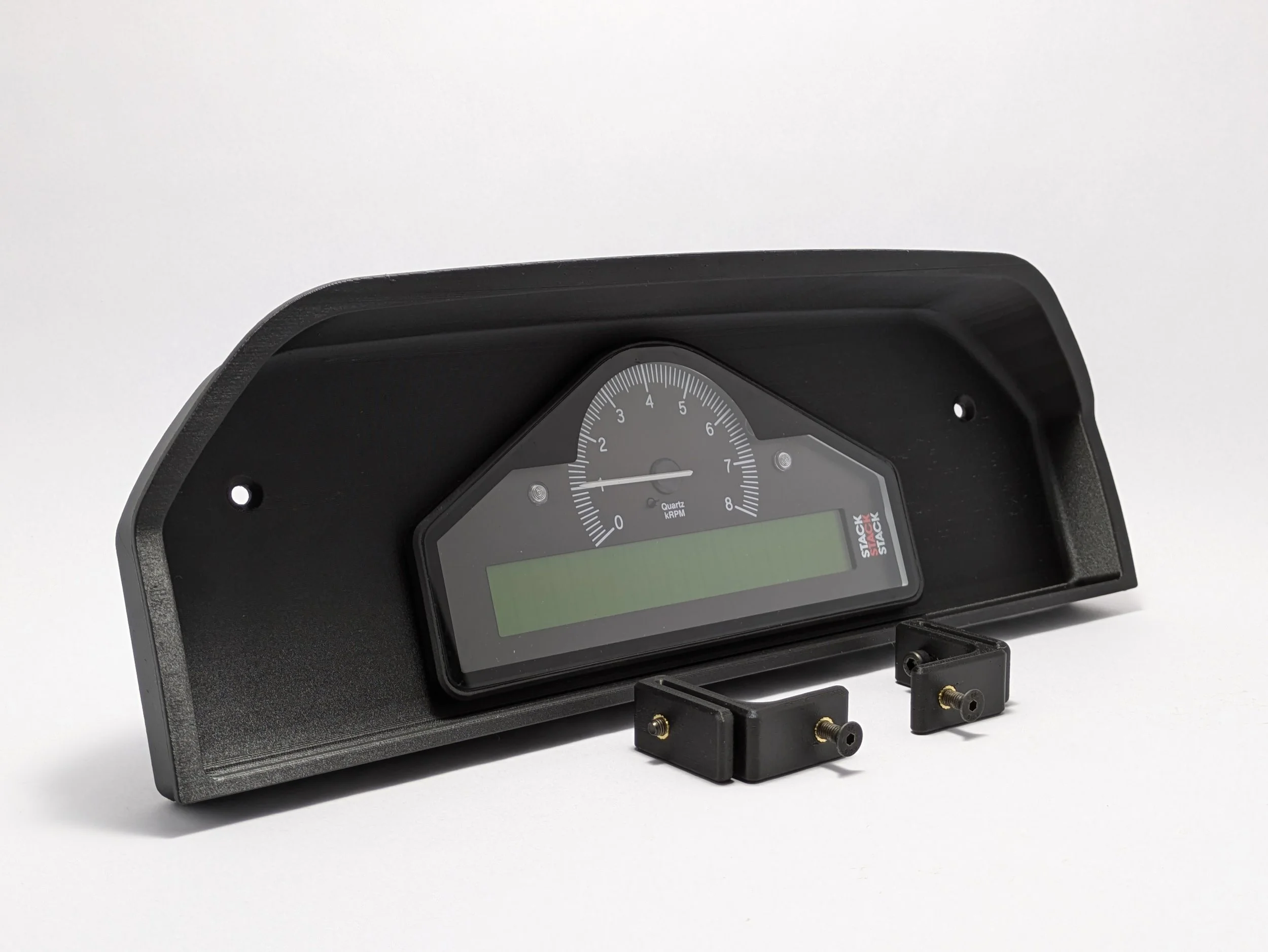 The original gauge cluster was removed, 3D scanned, and a bezel that would replace the gauge cluster was 3D modeled and 3D printed. A backing plate with a cutout for the Stack cluster was created and affixed to the bezel. In theory, the assembly is configurable for multiple types of aftermarket gauge clusters as backing plates with different cutouts can be easily created.